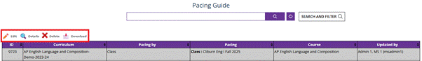 - Alternatively, the Pacing Guide page under My Activities à Curriculum & Assessment can be used to edit/delete/download the pacing guide